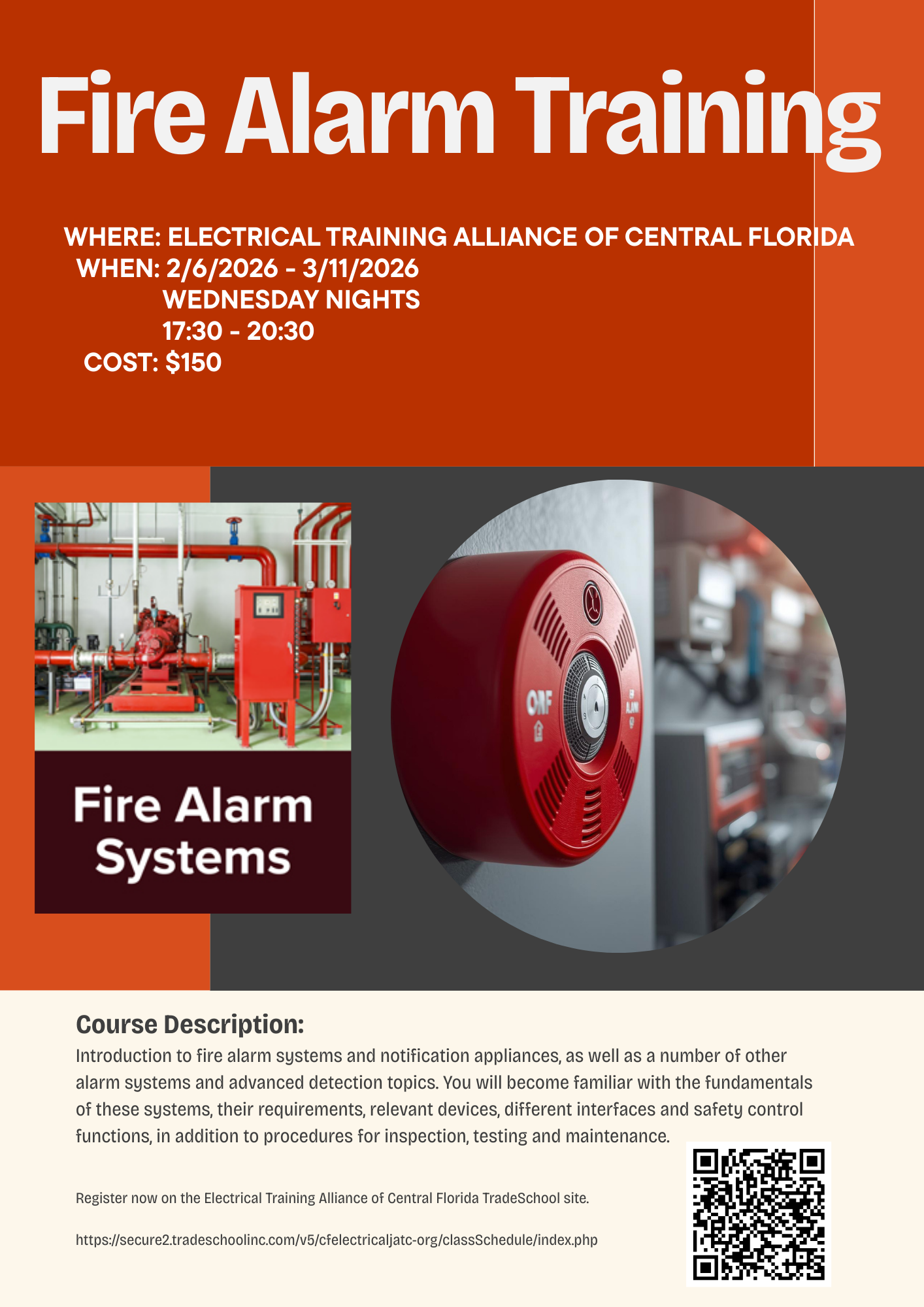 Brothers and Sisters. The Apprenticeship school will be hosting a fire alarm class on February 6 through March 11. See the attached flyer for additional details or contact the school for more information. Click link for registration. http://secure2.tradeschoolinc.com/v5/cfelectricaljatc-org/classSchedule/index. Read More...